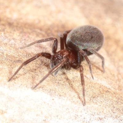 Une espèce en Alsace. Dotée de six yeux, elle chasse en lançant une soie collante et vénimeuse à distance sur sa proie, tel un filet afin de l'immobiliser. Nocturne, elle se déplace très lentement sur les murs. L'ornementation du thorax ressemble à des ouïes de violon. Taille 4 à 6 mm.