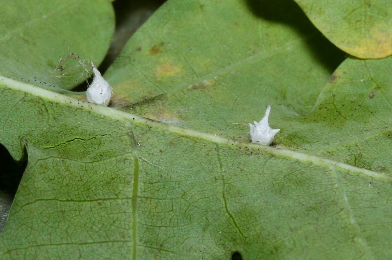 Deux cocons alignés sur la nervure centrale d'une feuille de chêne. Famille des Theridiidae - 68190 Ungersheim (Ecomusée d'Alsace) - 24 octobre 2020