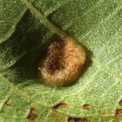 Galle ronde entièrement recouverte de poils dorés avec profonde dépression centrale. Dans chaque galle, une larve de guêpe. Pupaison au sol. Famille des Cynipidae - 68310 Wittelsheim (Rothmoos) - 05 octobre 2018