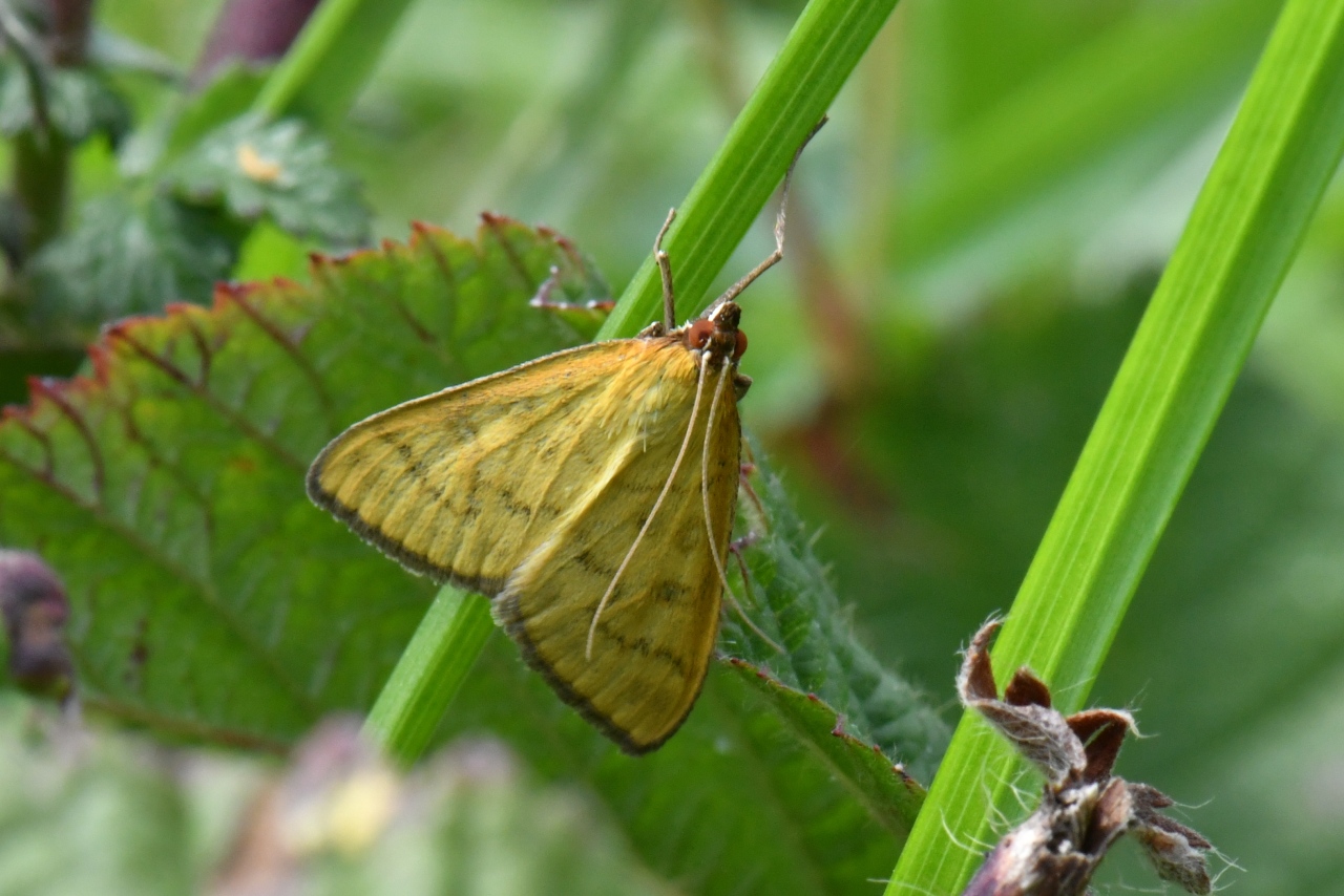 Les mâles volettent et se cachent sous les plantes des eaux dormantes, dans les fossés et mares. Famille des Crambidae - 68190 Ungersheim (Ecomusée d'Alsace) - 05 juin 2013