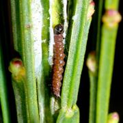 Taille 8,7 mm. Chenille dans sa loge de soie tissée entre des tiges de Cytisus scoparius, sa plante-hôte. Famille des Depressariidae - 68190 Ungersheim (Ecomusée d'Alsace) - 07 mars 2021