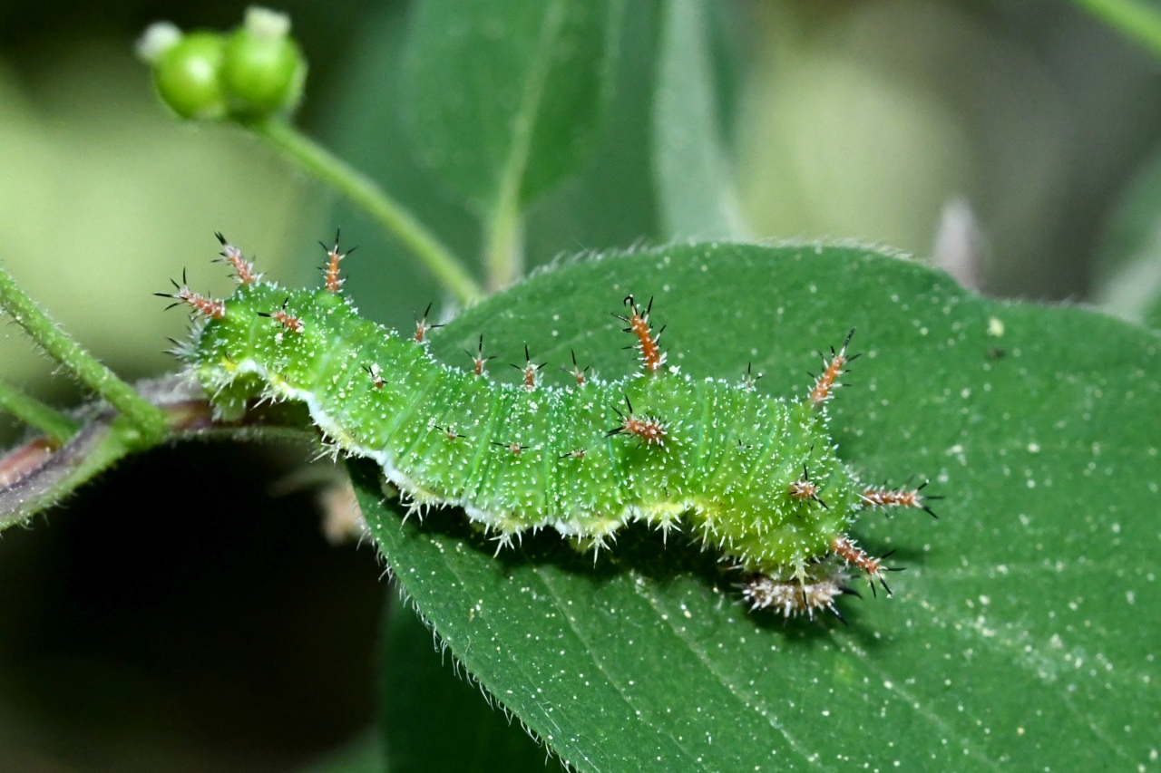 Taille 45 mm. P-h : Saule, Orme, Fruitiers, Peuplier-tremble. Scoli brun-orangés, tête noire. Famille des Nymphalidae - 68700 Wattwiller (Molkenrain 1040 m) - 06 juin 2018