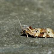 Janvier/avril. P-h : Chêne, Charme, Bouleau, Aubépine. Une des premières tordeuses, émergeant à la fin de l'hiver. Famille des Tortricodes - 68190 Ungersheim (Ecomusée d'Alsace) - 16 mars 2014