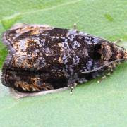 Mai/juillet. P-h : Erables (surtout A. pseudoplatanus). Frange antérieure éclaircie au niveau de deux petits points clairs marginaux. Famille des Tortricidae - 68470 Wesserling - 24 juin 2017