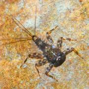 Taille : 6 mm. Porte 7 paires de branchies arrondies dont les 6 premières sont doublées. Famille des Baetidae - 68190 Ungersheim (Ecomusée d'Alsace) - 23 mars 2014