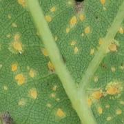 Taches jaunes à brunes sur les feuilles. Ces taches sont formées par les pucerons (0,7-0,9 mm) jaunes, pyriformes, à antennes très courtes, se nourrissant sur l'envers des feuilles. Famille des Phylloxeridae - 68540 Feldkirch (Entenbad) - 03 juillet 2016
