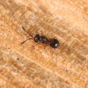 Taille 1,2 mm. Pond dans les oeufs des carabides au niveau du sol. Se déplace en sautant. Famille des Scelionidae - 68190 Ungersheim (Ecomusée d'Alsace) - 16 mars 2015